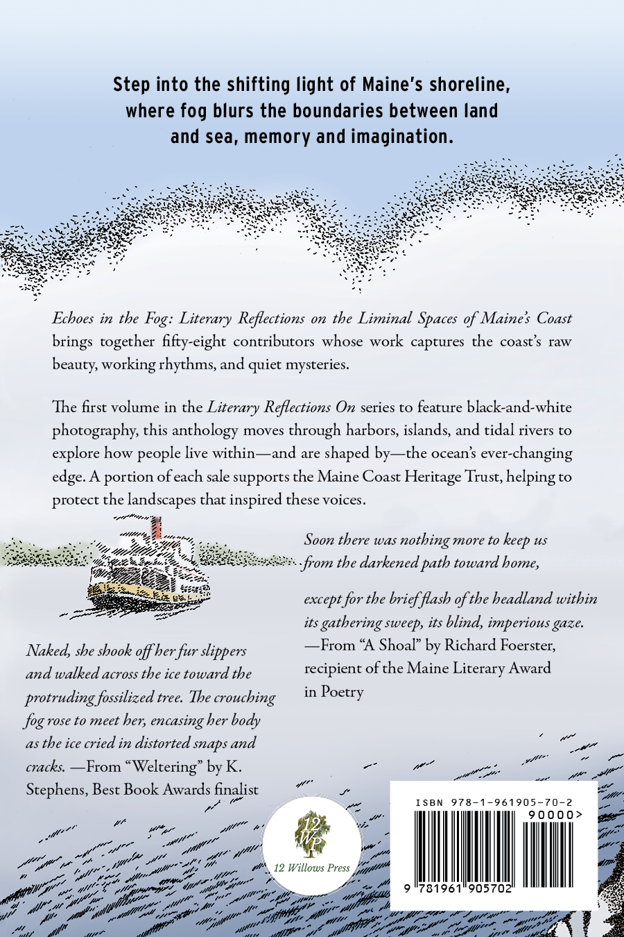 Echoes in the Fog: Literary Reflections on the Liminal Spaces of Maine’s Coast gathers 58 poets, essayists, storytellers, and photographers exploring the mystery and beauty of Maine’s coast. From island harbors to fog-draped peninsulas, each piece reveals how tide, weather, and light shape the lives of those who call the shoreline home.